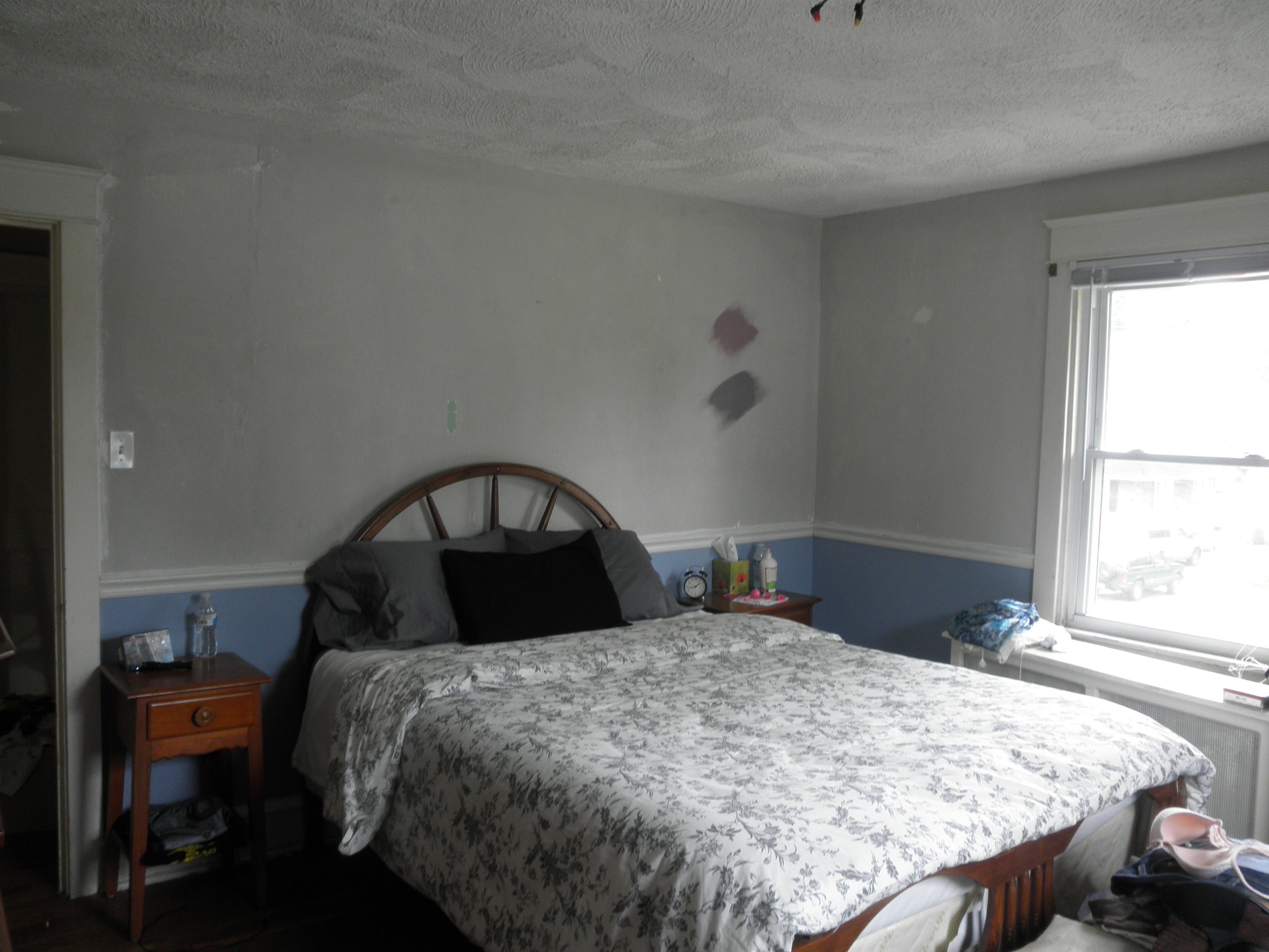 In the meantime, though, I want to share how I transformed our master bedroom. The wall paper was too country for my taste, and the ceiling fan was covered in so much dust that we had to put down drop cloths to take it off. I’m not kidding – CLUMPS of dust.