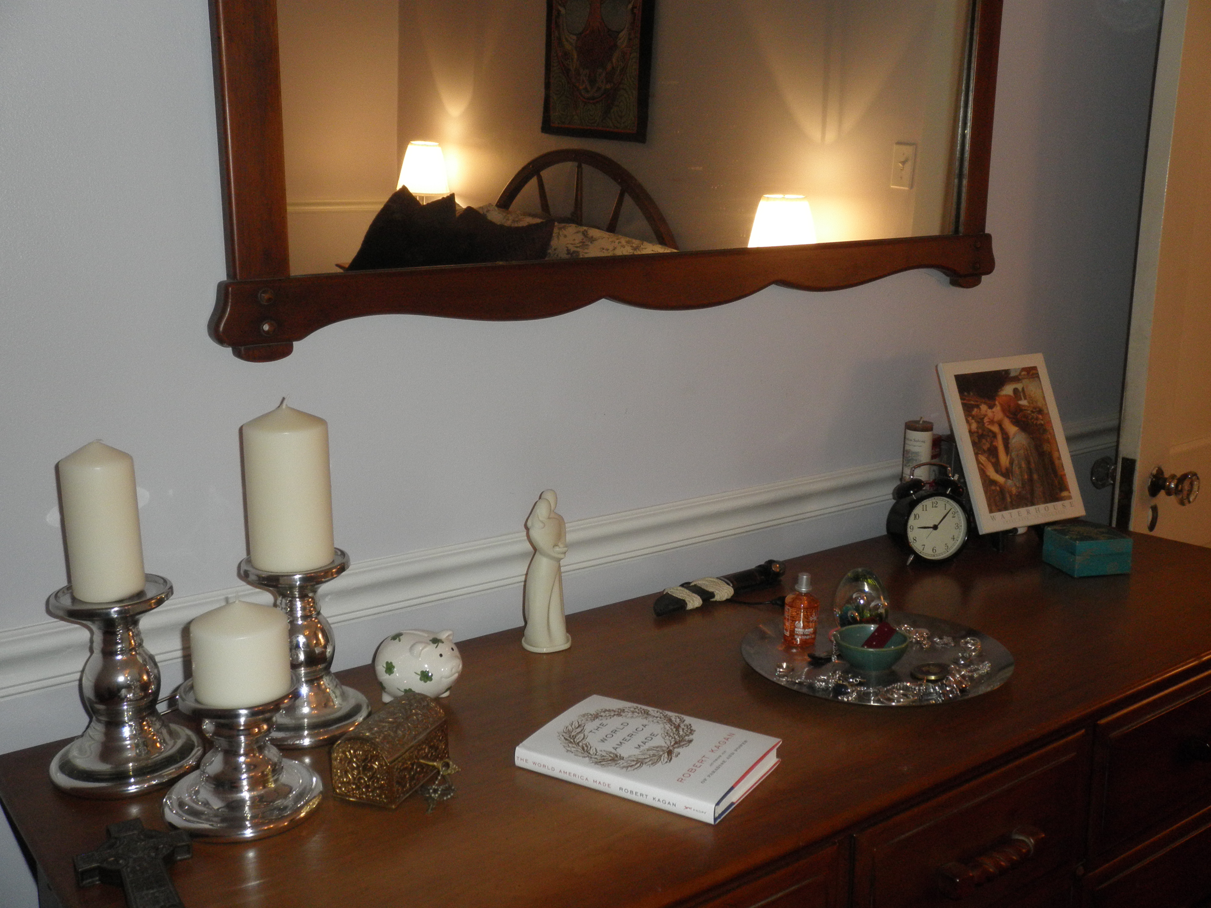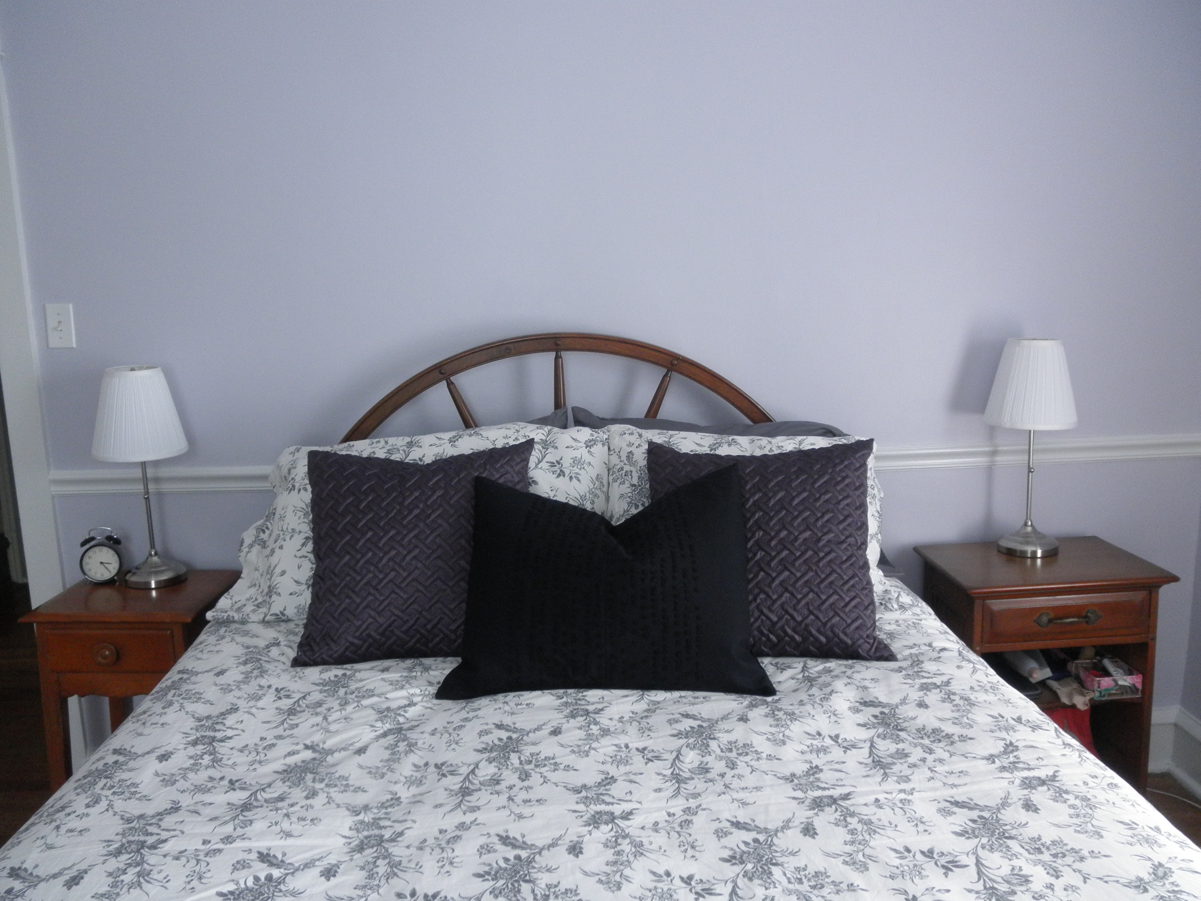And then I needed bedding. Our old bed was a full size, and when we inherited the furniture, we also inherited a queen size bed, so needing to get all new linens, I ventured again to Ikea. I didn’t want to overwhelm the room with more color, so I went with a simple but elegant duvet cover with a white background and charcoal grey print. Pillows were scored from Home Goods.