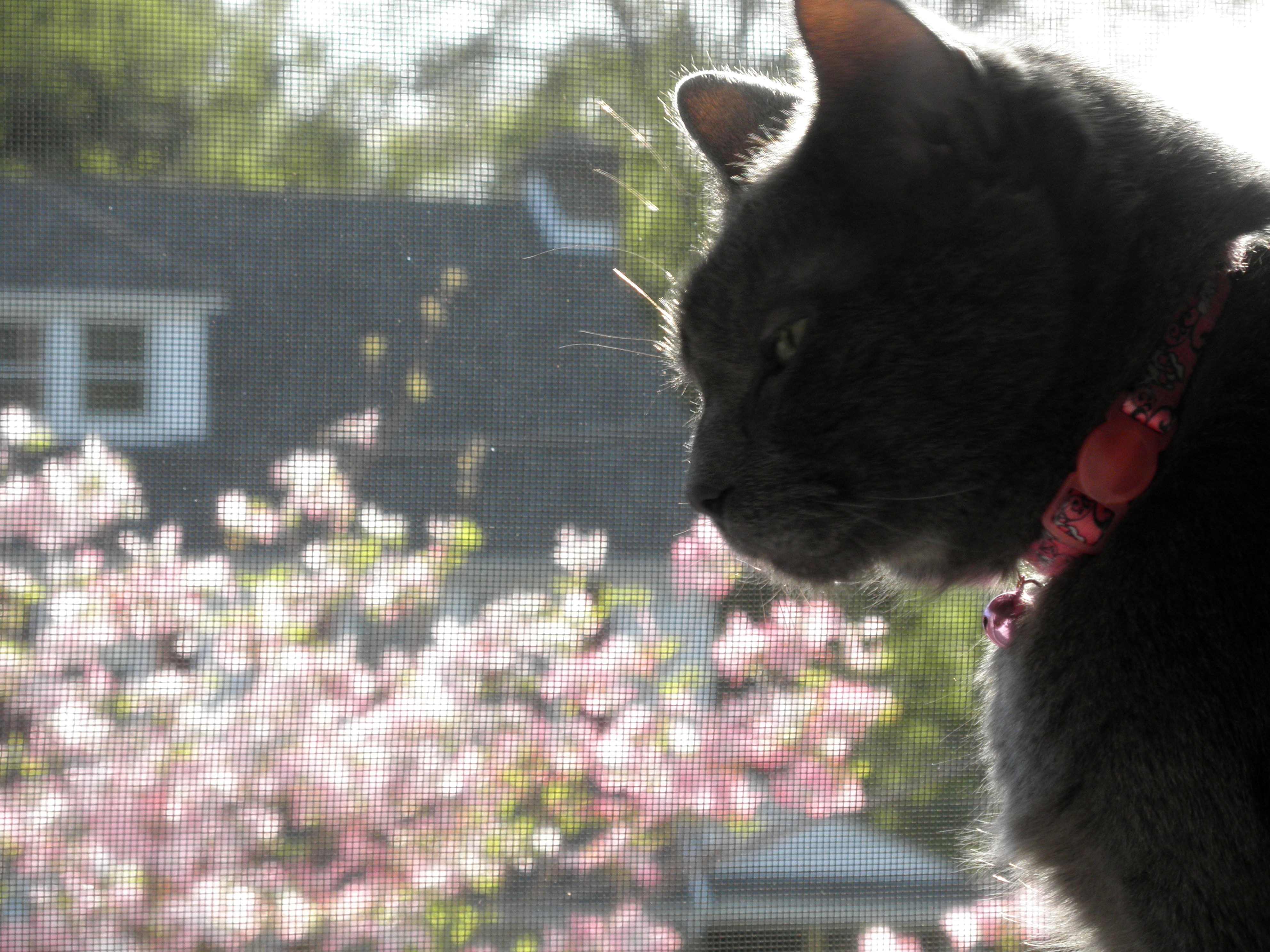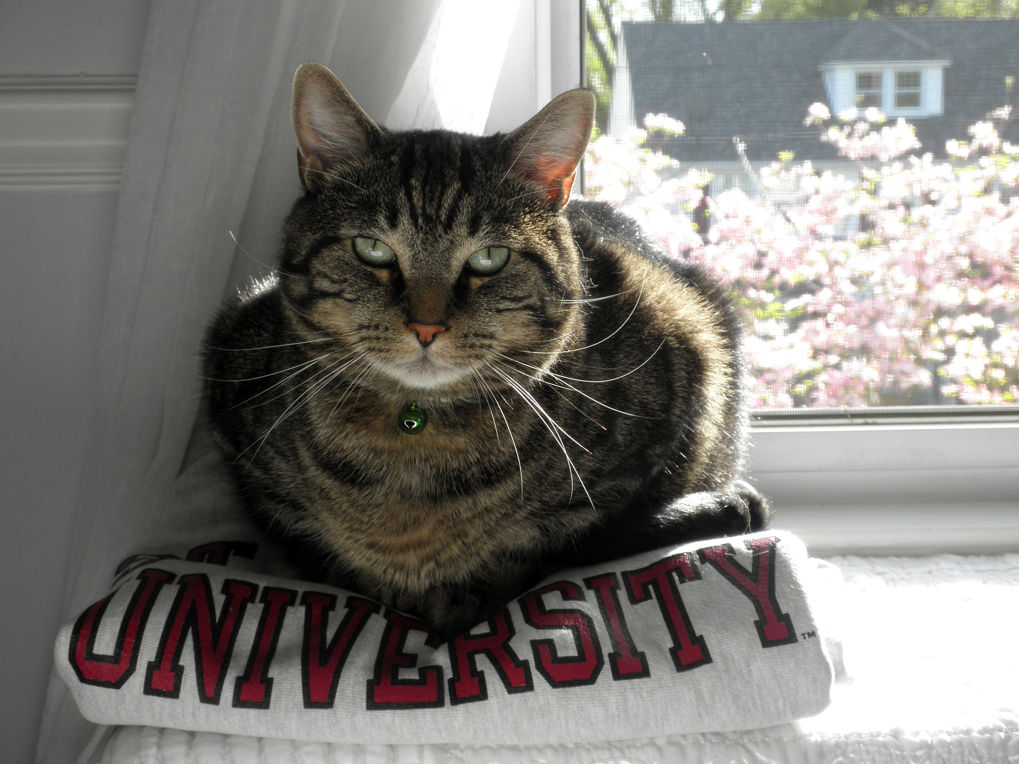I promised myself that I wouldn’t post a picture of the cats in the bedroom this week. But then I went upstairs to get my camera and I found Loki guarding my SJU sweatshirt a.k.a. basking in the sun and just generally loving the open window. You have to click on these to enlarge and show the true beauty *ahem* manliness of his green eyes…