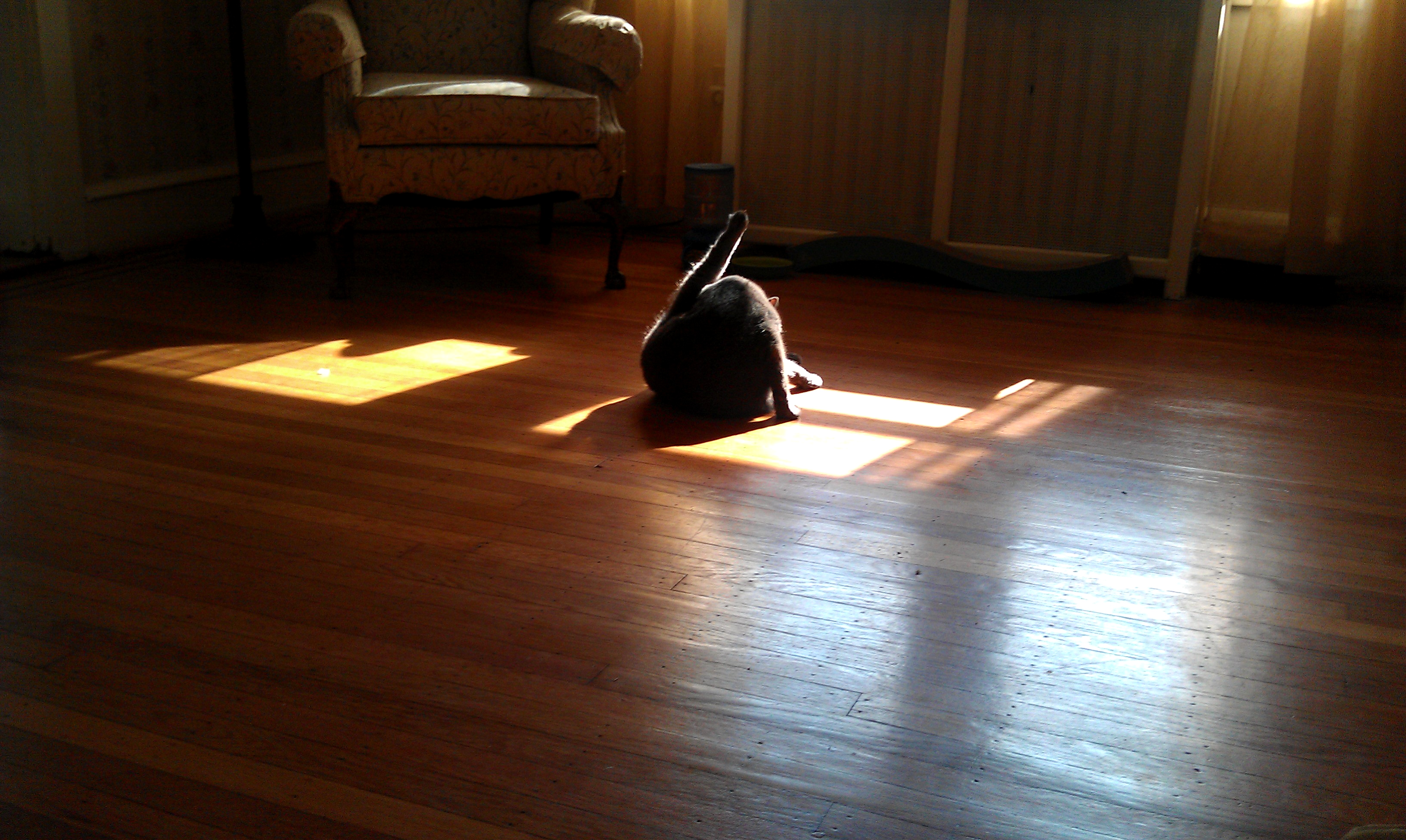 Luna has never been shy, especially when it comes to her grooming habits, aka kitty yoga. But when we moved into the house two years ago, everything was an exploration and everything made the cats skittish.