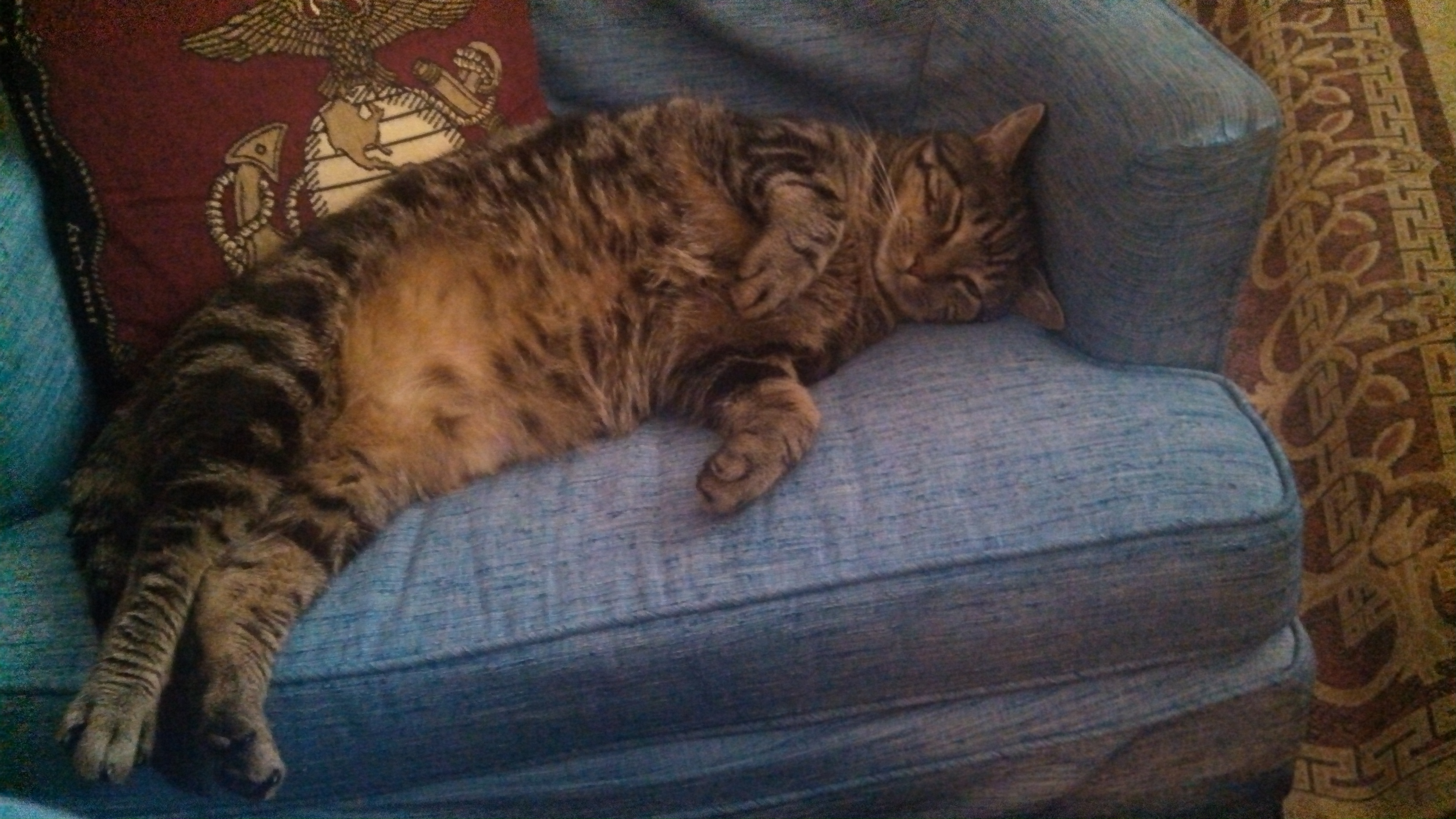 The kitties are loving the fact that the weather has changed and cooled down so they are back to their old habits of sleeping with us and lounging on the chairs near us when we’re on our computers.