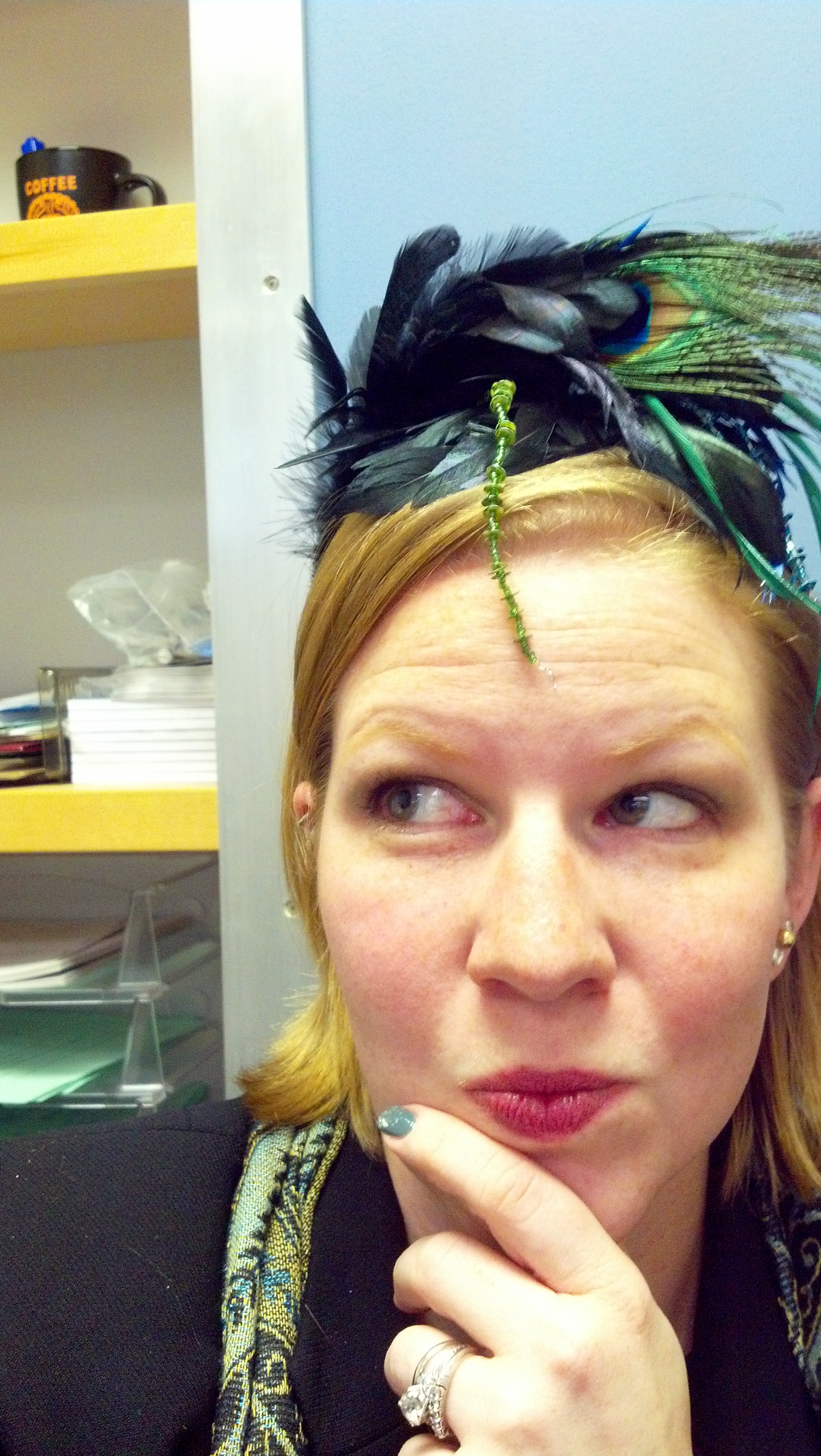 2013-10-31 09.41.54Now, the Man made fun of me, as he was taking the picture because the running joke is that our house is the “Where’s Waldo?” of peacocks and it’s scary that I could throw this together. But in my defense, the scarf is from my sister-in-law, the pin was my grandmother’s, and no peacock is complete without the rocking headband my aunt Susan gave me a few years ago. Needless to say I was one sassy admission coordinator on Halloween.