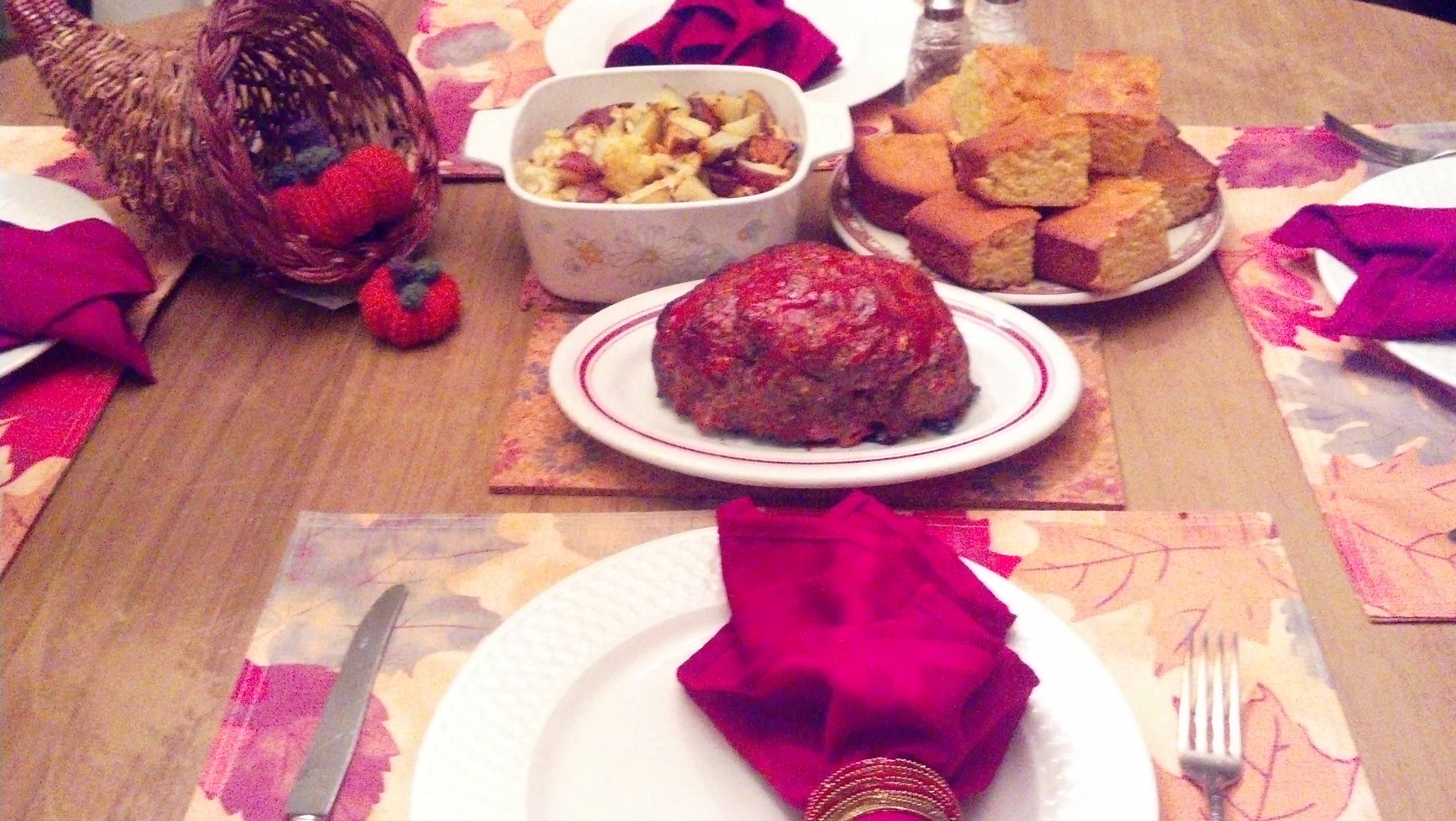 Then the weekend commenced and so did crazy errand running, and of course fall cooking! The day started out with the Man and I going to an estate sale which was boring but we each scored a good book to read. After he went to bed (he works nights still… ugh) I made two loaves of meatloaf (one to eat, one to freeze) with a honey/ketchup/Worcestershire sauce glaze, roasted cauliflower and potatoes with garlic and Parmesan, and cornbread on Saturday for dinner.