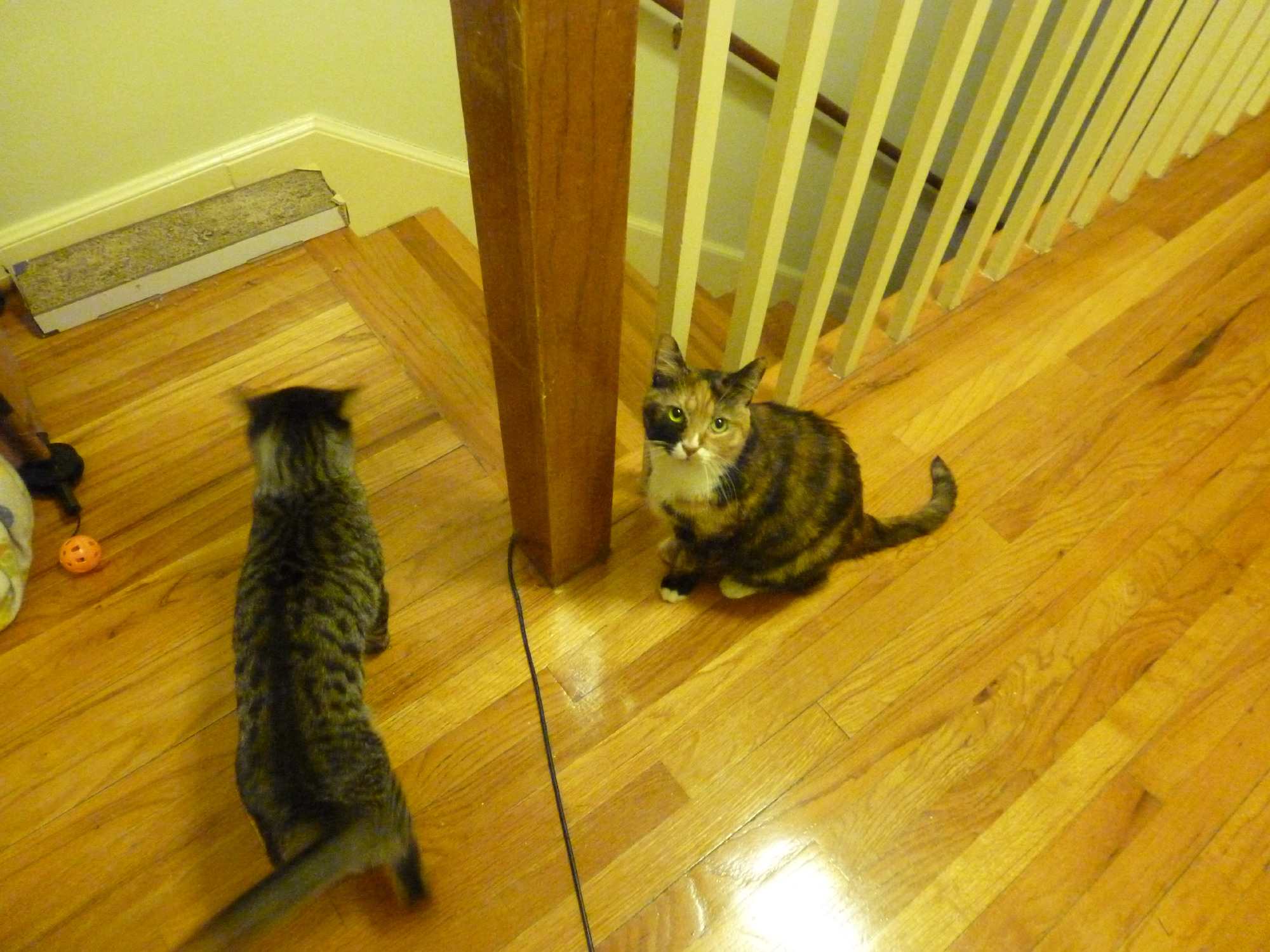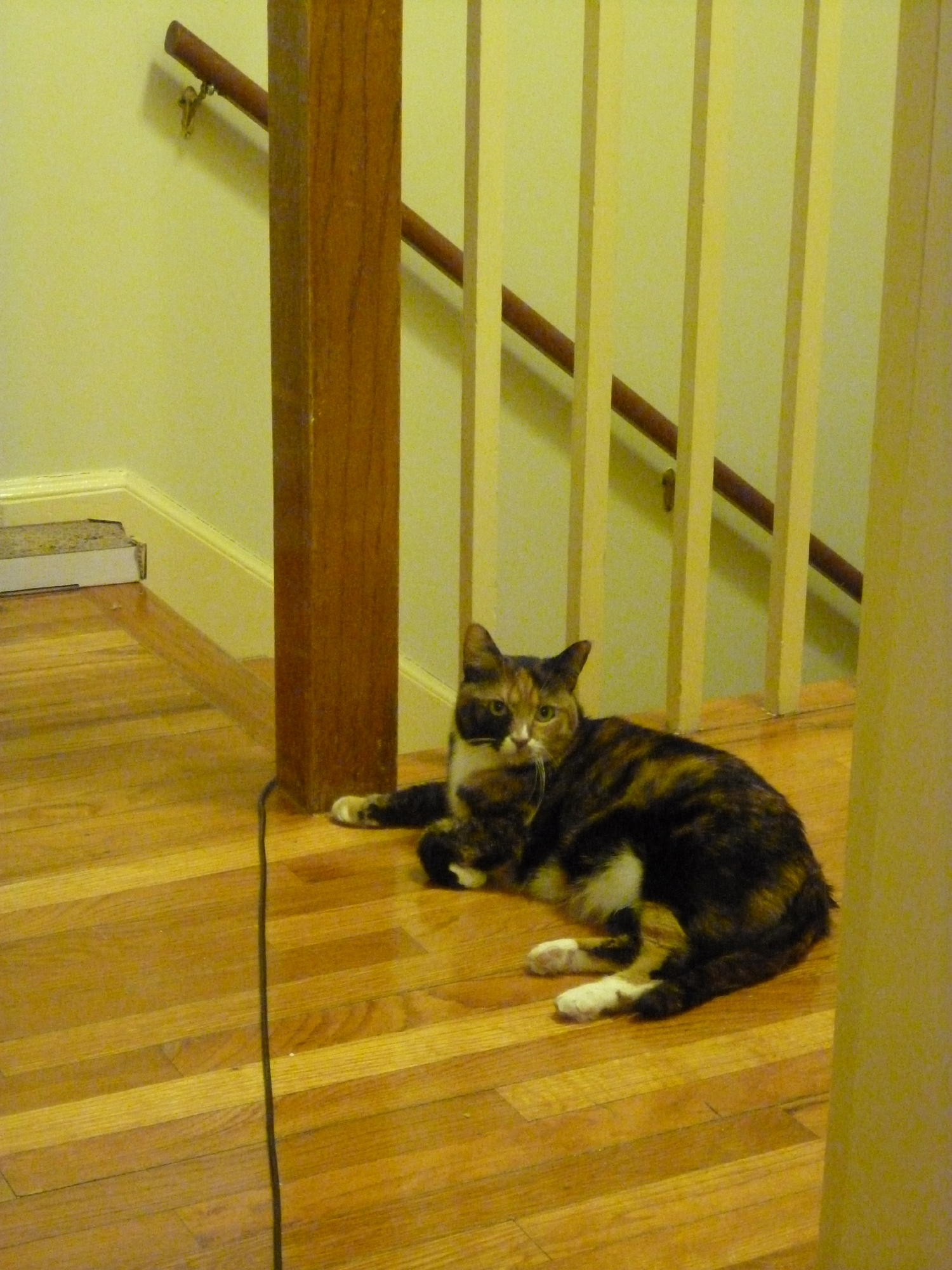 Anyway, after a bit of stalking and attempting to conceal the camera, I give you Mary-Alice, at the top of the stairs begging to be carried back down. (Unfortunately, as this is a still picture, you do not get to hear the sad, weak mews of her plight.)