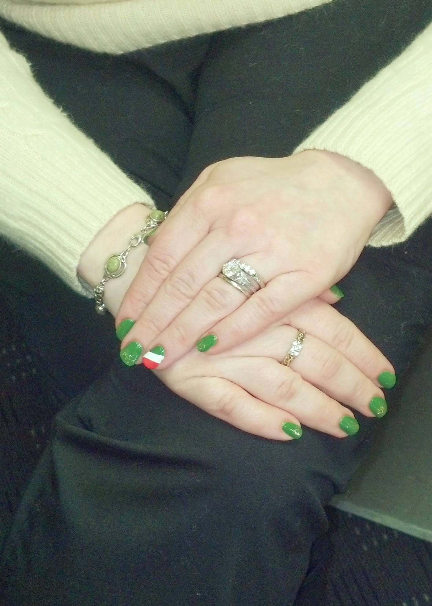 I decided to wear a very warm, cream colored sweater this morning, but I decked out in a Connemara marble necklace that was my great Aunt’s, along with the Connemara marble Celtic knot bracelet that the Man gave me on our wedding day. And, of course, I had to do my nails.