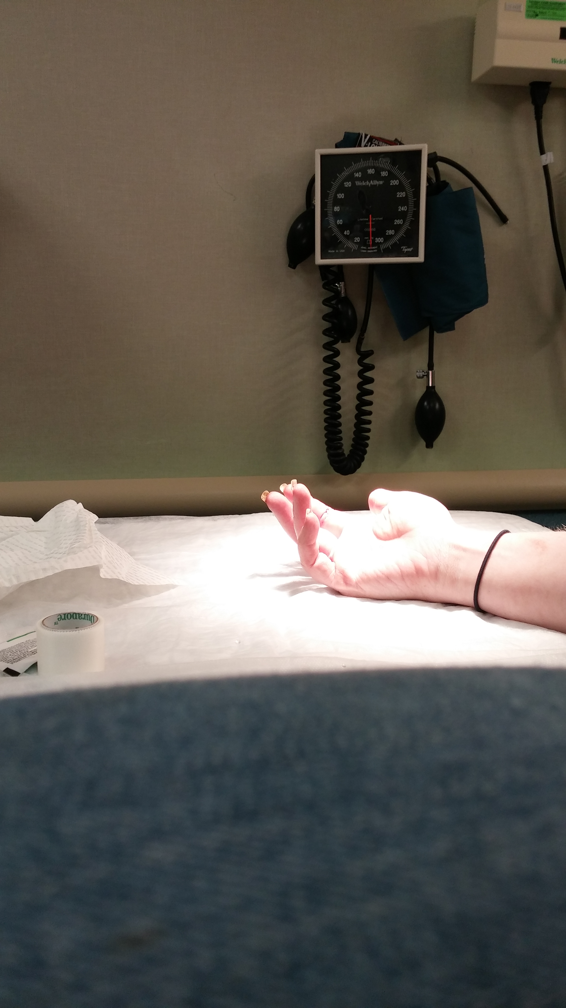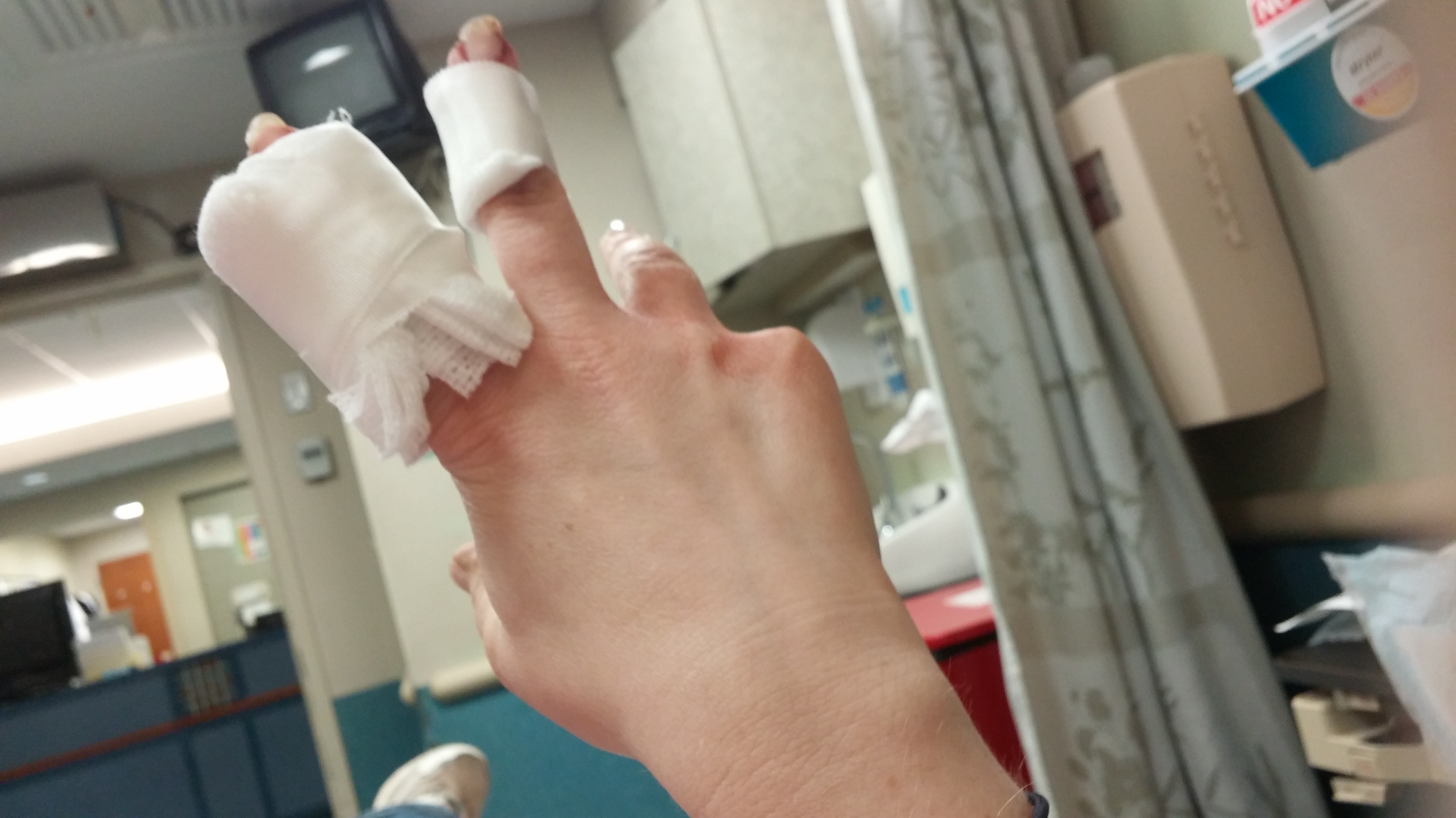 I didn’t have to wait very long to see the PA, and it turns out I know her through my work at the university. I have to say seeing a friendly face put me at great ease. I even managed to take a “selfie” of my gauze wrapped fingers. I still hadn’t seen the damage. I knew my finger was still attached, but I didn’t know how bad it was, and the pain didn’t give any indication until fifteen minutes or so after getting into a room and the adrenaline of getting myself to the hospital started to wear off.