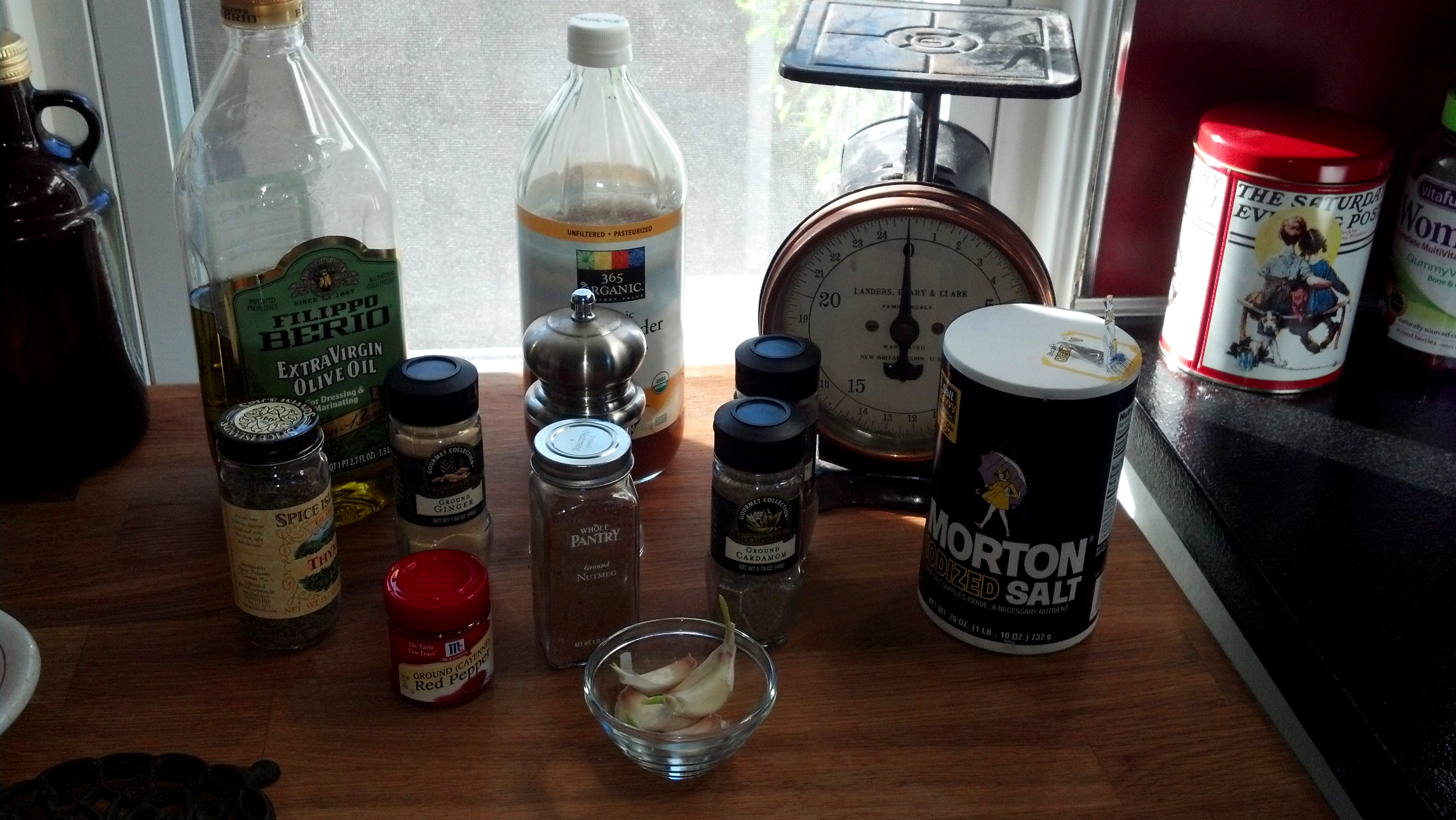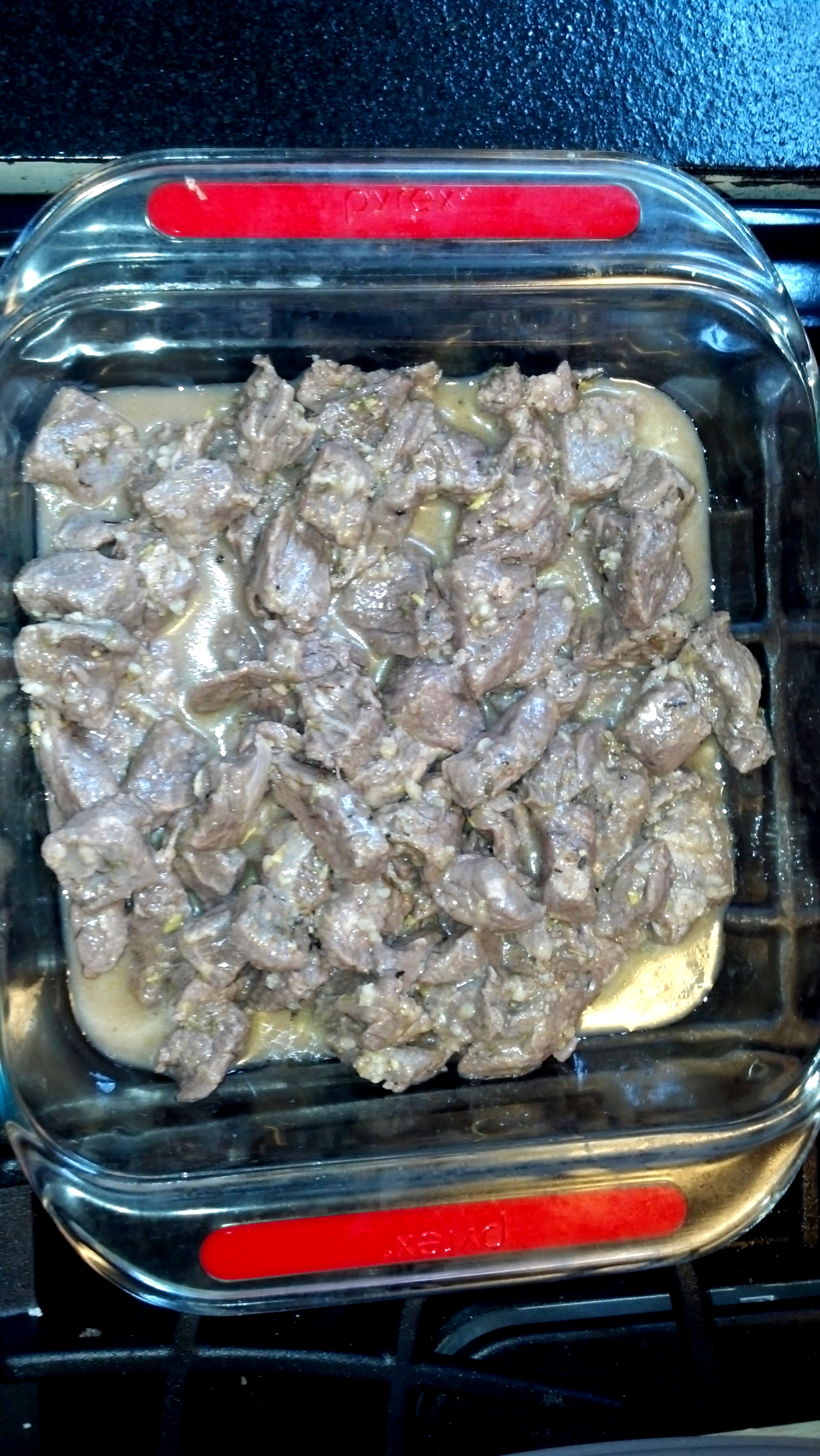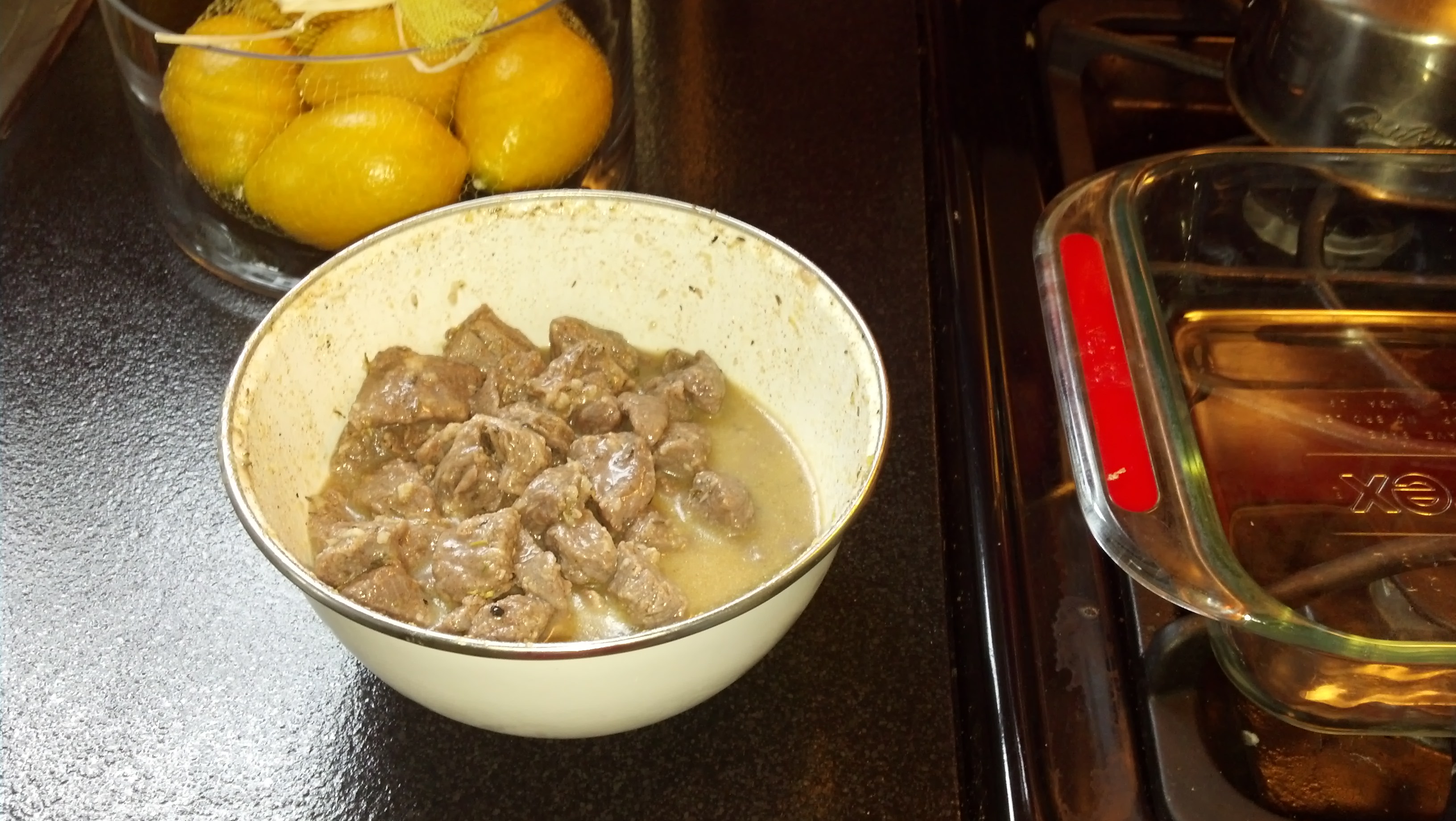 Mix the spices, lemon juice, and apple cider vinegar in a bowl/container large enough for the marinade and beef. (I recommend one with a cover) Whisk vigorously until well combined. Add your beef, cut into chunks that are bite sized. Stir everything around well, and then add the oil. (NOTE: Several of the recipes I pulled from also called for 1/2 tsp. of both cumin and fennel, but having neither I left them out.) I then put the cover on my bowl and shook vigorously. You want to let this marinate in the fridge overnight. Every few hours give it a good shake and return to the fridge.