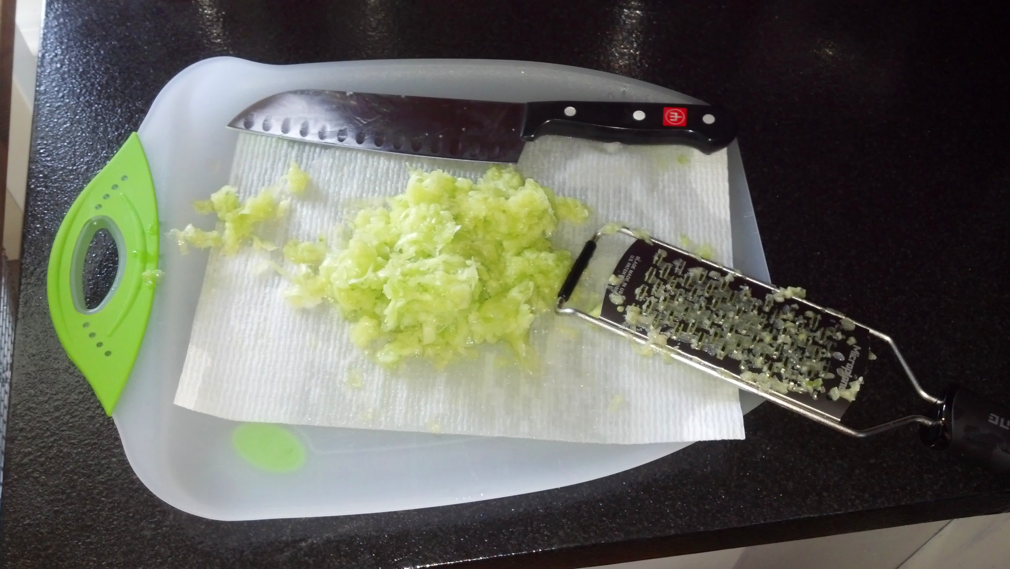 At this point, peel your cucumber and start the grating fun! Now I had no idea how to do this. Yes, that sounds stupid but… I had never done anything but slice a cucumber up for hors d’oeuvres before so I did watch a video on how to peel a cucumber and the trick is just a sharp knife and patience. Oh, and when grating, do not grate your fingers. Trust me.