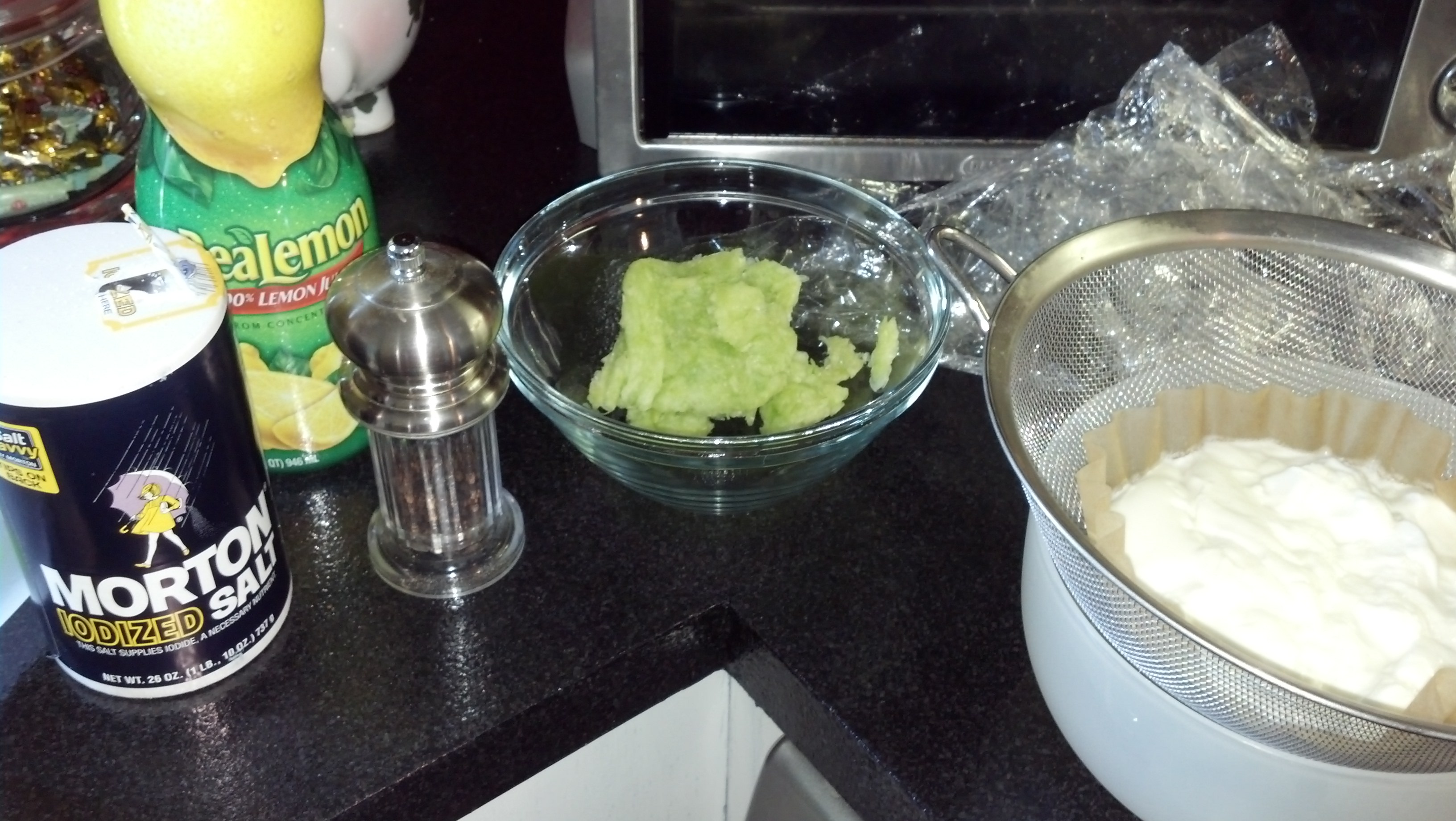 I used my handy dandy Microplane grater. You want to remove as much moisture as possible from the cucumber. What I did was grated directly onto a paper towel. I then picked the paper towel up, put a thick kitchen towel underneath, a paper towel on top of the mash, and another kitchen towel on top. You want to let this all sit FOR ABOUT AN HOUR in the fridge. This will give the maximum time possible for the liquid to drain out. After the cucumber is sufficiently sapped of its moisture, combine everything in a bowl and mix. I did everything to taste as I went, but as a base probably use a 1/2 tsp. of everything. The sauce will not be as thin as the tzatziki you’ve probably had on gyros, but it is equally yummy if not a bit lumpy.