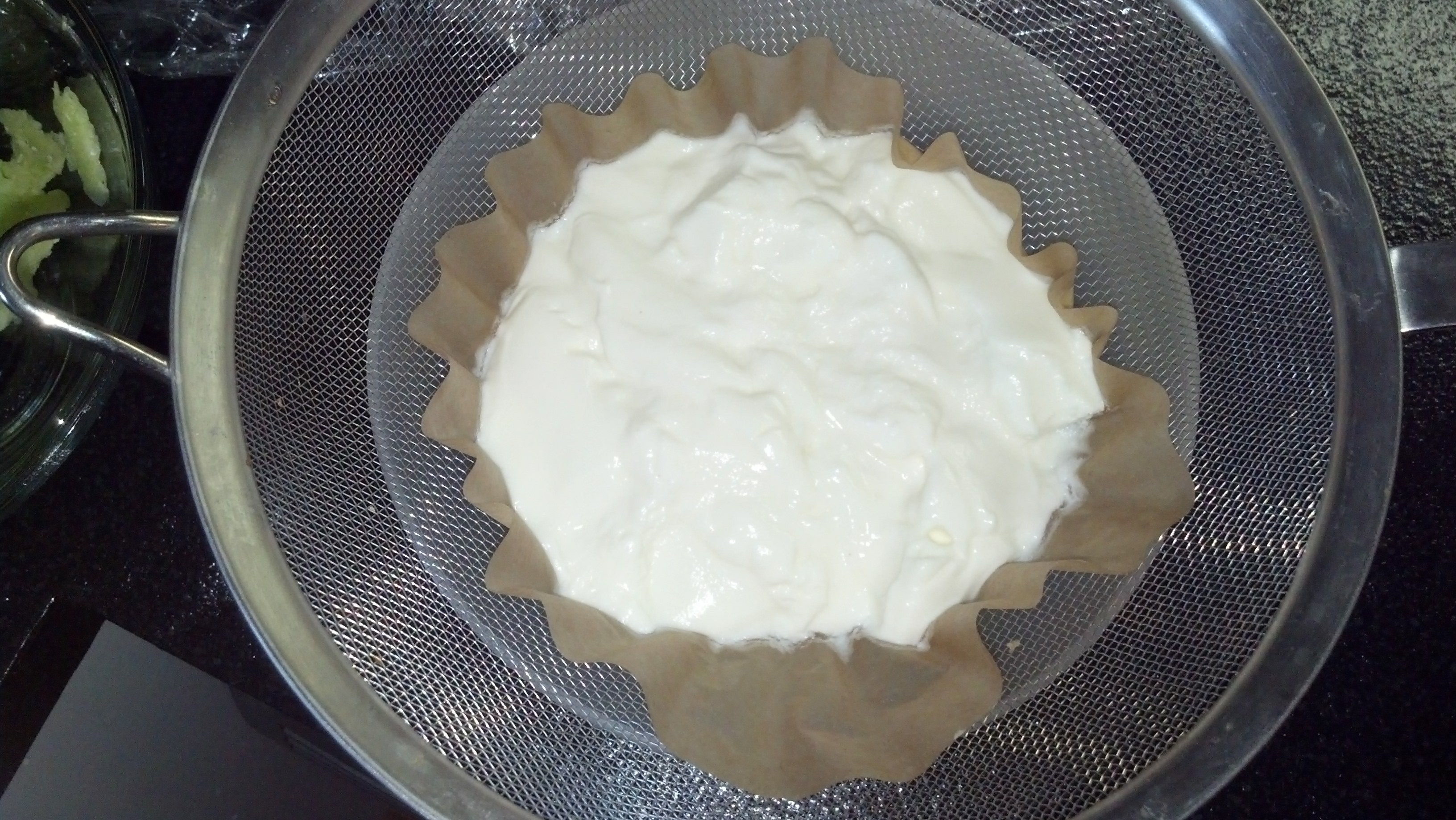 The night before, you will need a colander and cheesecloth or a coffee filter. Place your colander over a bowl, line it with your strainer of choice (I used a coffee filter) and put the yogurt in it. Cover everything up with plastic wrap and let sit in the fridge overnight. When you take it out the next day, your coffee filter will be saturated.