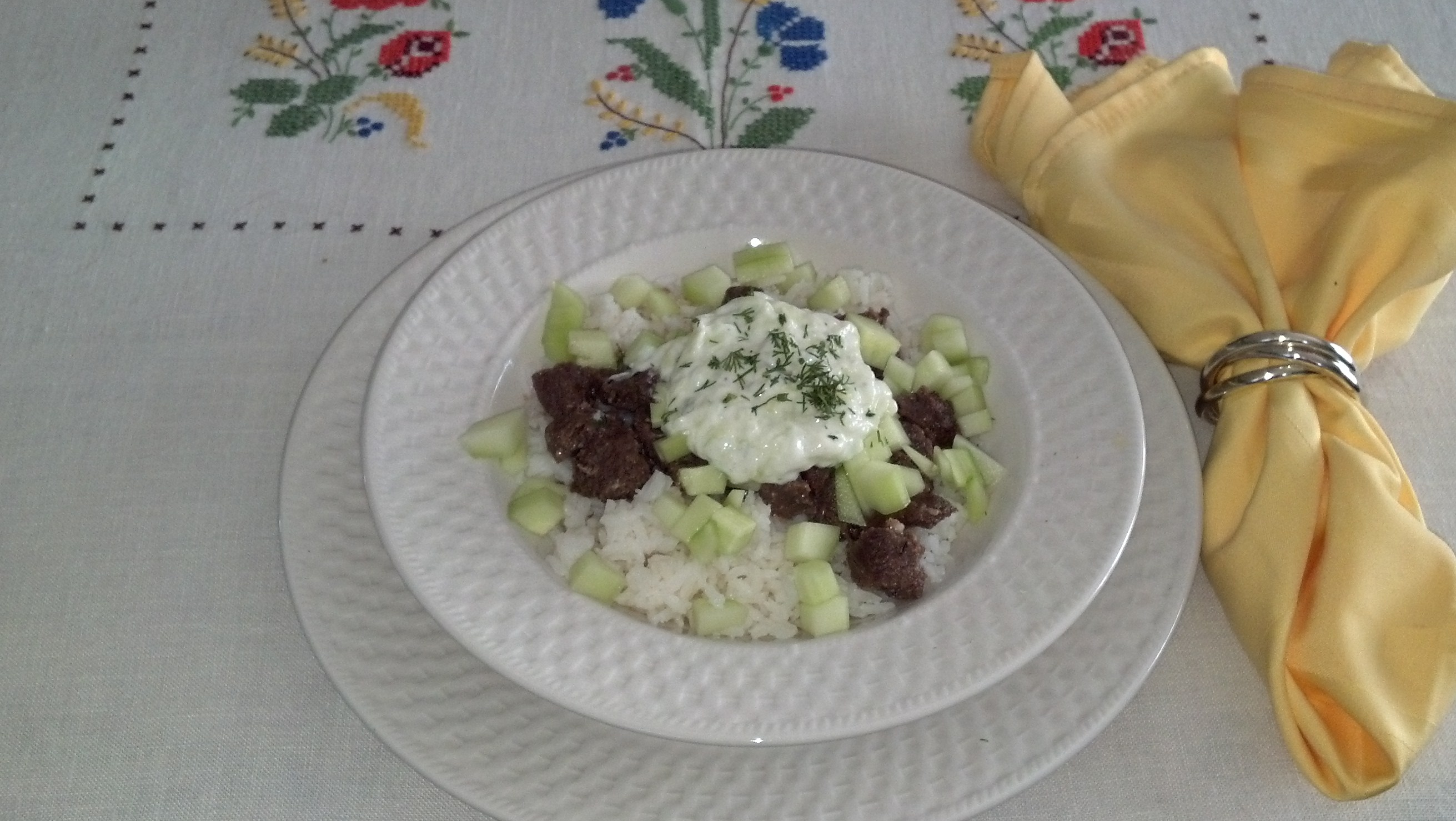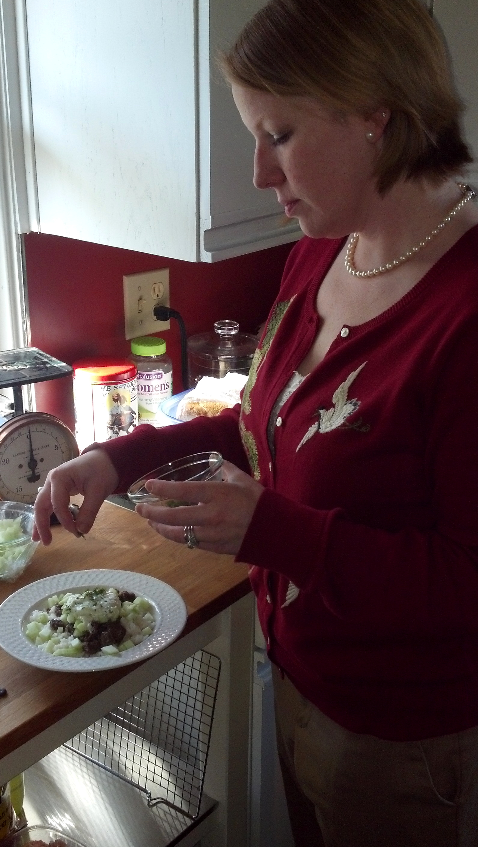Recommendations ranged from letting the tzatziki sit in the fridge from an hour to four hours for the ingredients to all combine and give the best taste. I gave it a half hour at best. No matter what I say serve chilled. I served everything over white rice (South Carolina long grain if you must know) along with a sprinkling of dill and diced cucumbers. Then my favorite part – garnishing!