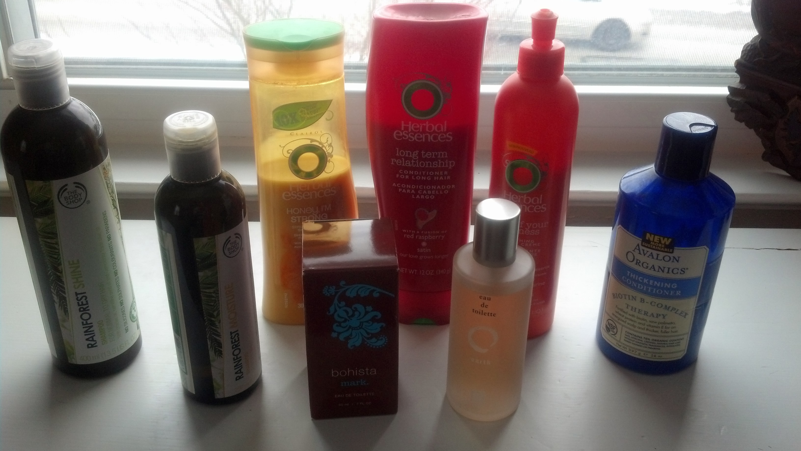 In the past few years since we’ve been in our house, I could count how many bottles of shampoo and conditioner I’ve bought on one hand. That’s because, like so many of us crazy women, I used to constantly buy the newest product to get the shiniest, healthiest, fullest hair. Mostly, what I found out, was that very few of them helped at all. So gradually I switched to more natural products. When we moved into the house and I unpacked everything into the linen closet, I decided I had to use every partially filled bottle I owned before I could buy anything else. And actually, I’ve done pretty well! But this past weekend while putting away towels I decided to unearth the stash of what was left (along with two unused bottles of perfume I had hidden! Hello GAP… you haven’t made this perfume in how many years??? Still smells the same… )