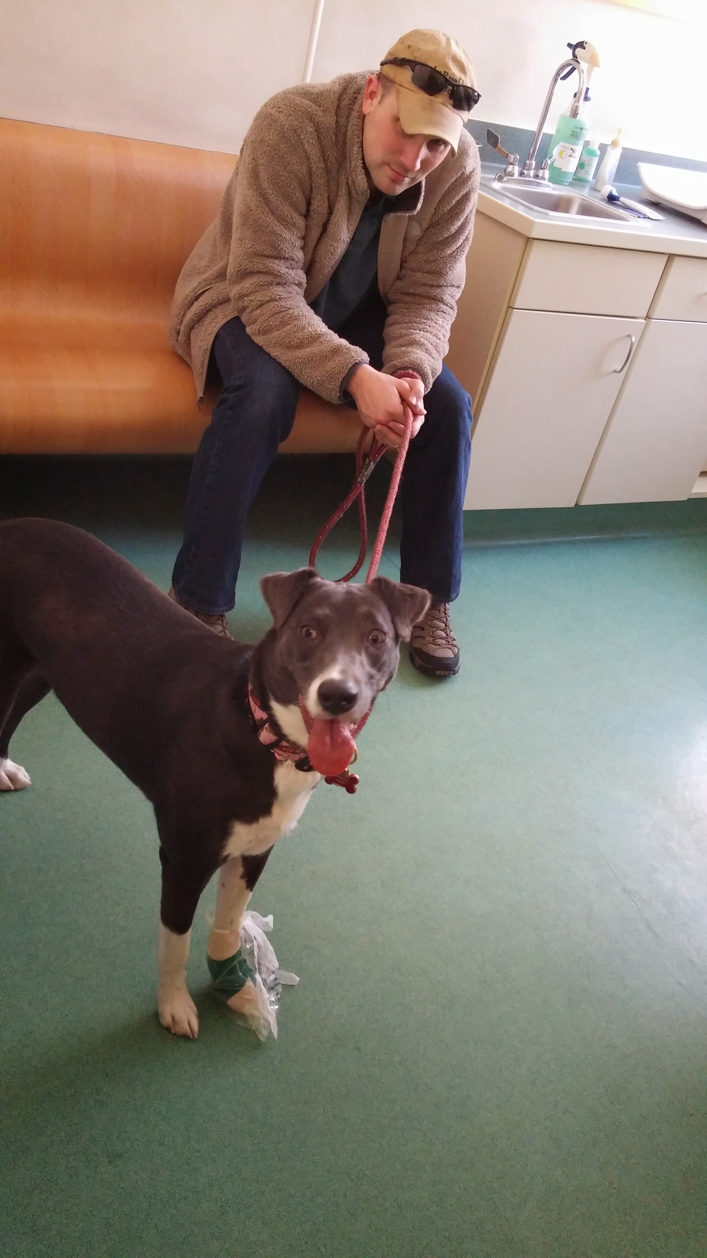 She didn’t mind the bandage at all, but the vets had to construct a makeshift “boot” (out of a plasma bag – vet DIY!) to make sure the bandaging didn’t get wet. Of course I had to video the “boot walk” (because I’m mean like that).